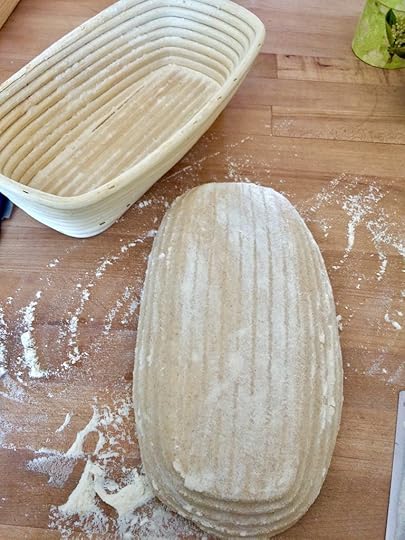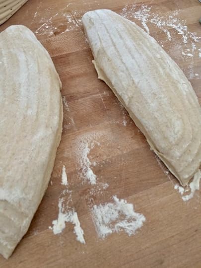 So why not cut one long risen loaf lengthwise and have two — ta-da! — baguettes? Or maybe they are more like bâtards; I am on the lookout for an even longer proofing basket (called a banneton, although almost any basket works). (I do see that there are specific bannetons for baguettes. Maybe I need those.)