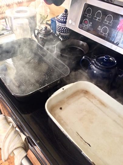 You’ve already pre-heated your oven to 450° and placed two pans of boiling water, one on the one rack right up at the top and and the other on the floor of the oven. The dough pan goes on the rack in the middle.