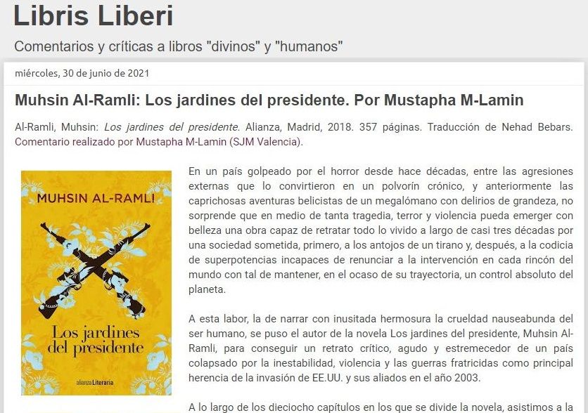 A esta labor, la de narrar con inusitada hermosura la crueldad nauseabunda del ser humano, se puso el autor de la novela Los jardines del presidente, Muhsin Al-Ramli, para conseguir un retrato crítico, agudo y estremecedor de un país colapsado por la inestabilidad, violencia y las guerras fratricidas como principal herencia de la invasión de EE.UU. y sus aliados en el año 2003.