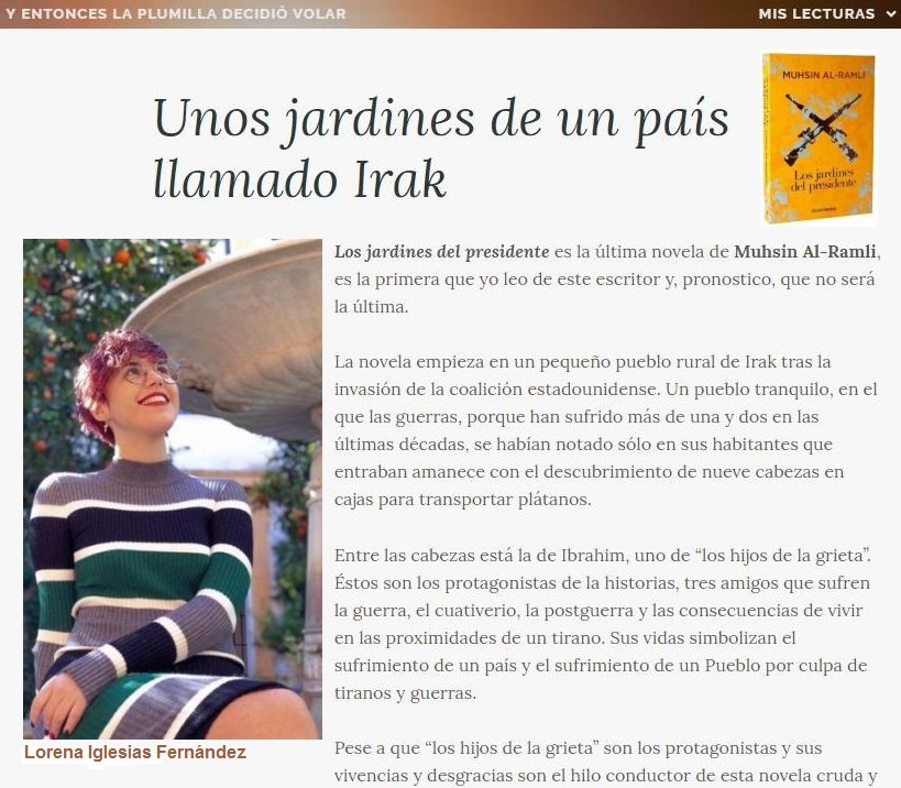 Lorena Iglesias Fernández Los jardines del presidente es la última novela de Muhsin Al-Ramli, es la primera que yo leo de este escritor y, pronostico, que no será la última.La novela empieza en un pequeño pueblo rural de Irak tras la invasión de la coalición estadounidense. Un pueblo tranquilo, en el que las guerras, porque han sufrido más de una y dos en las últimas décadas, se habían notado sólo en sus habitantes que entraban amanece con el descubrimiento de nueve cabezas en cajas para transportar plátanos.Entre las cabezas está la de Ibrahim, uno de “los hijos de la grieta”. Éstos son los protagonistas de la historia, tres amigos que sufren la guerra, el cautiverio, la postguerra y las consecuencias de vivir en las proximidades de un tirano. Sus vidas simbolizan el sufrimiento de un país y el sufrimiento de un Pueblo por culpa de tiranos y guerras.Pese a que “los hijos de la grieta” son los protagonistas y sus vivencias y desgracias son el hilo conductor de esta novela cruda y salvaje de la época en la que Saddam Hussein, aunque nunca se le nombre, gobernaba el país, yo me voy a detener en las mujeres que orbitan alrededor de estos personajes, porque el sufrimiento de estas mujeres, ficticias, es el reflejo de lo que muchas otras, reales, sufren a diario en muchos países y que muchas veces son olvidadas.Samiha, obligada a casarse con uno de sus primos, en vez de con la persona que ama, cada vez que huye de su marido es golpeada y obligada a volver, hasta que es repudiada por su marido.Quisma, una mujer joven con altas aspiraciones en la vida. Se casa con un oficial del Ejército, es violada por un hombre, que no voy a desvelar, y tras la invasión su marido desaparece. Se queda viuda, con un hijo, y con la “necesidad” de casarse para evitar algunas suspicacias de la sociedad.Zakia, otra mujer joven, pero esta con una discapacidad intelectual. Un hombre joven, casi de la familia, se aprovecha de su discapacidad para tener relaciones sexuales con ella. Se queda embaraza, la encierran hasta que da a luz y tras eso, la lapidan y la entierra. Los hombres que le hacen todas estas cosas viven su vida después como si nada.Zeineb, una anciana que, por las convenciones sociales, aguantó una vida de horrores, que la mantuvo en vilo durante toda su vida.Estas son sólo cuatro de las mujeres que aparecen en la novela, son cuatro historias de injusticias que miles de mujeres en Irak y en otros muchos países viven a diario. Son cuatro historias que tienen un apartado reducido dentro de la historia mayor, pero que sin las cuales la historia no se desarrollaría tal y como lo hace.https://plumilladecidiovolar.wordpress.com/2019/04/01/unos-jardines-de-un-pais-llamado-irak/