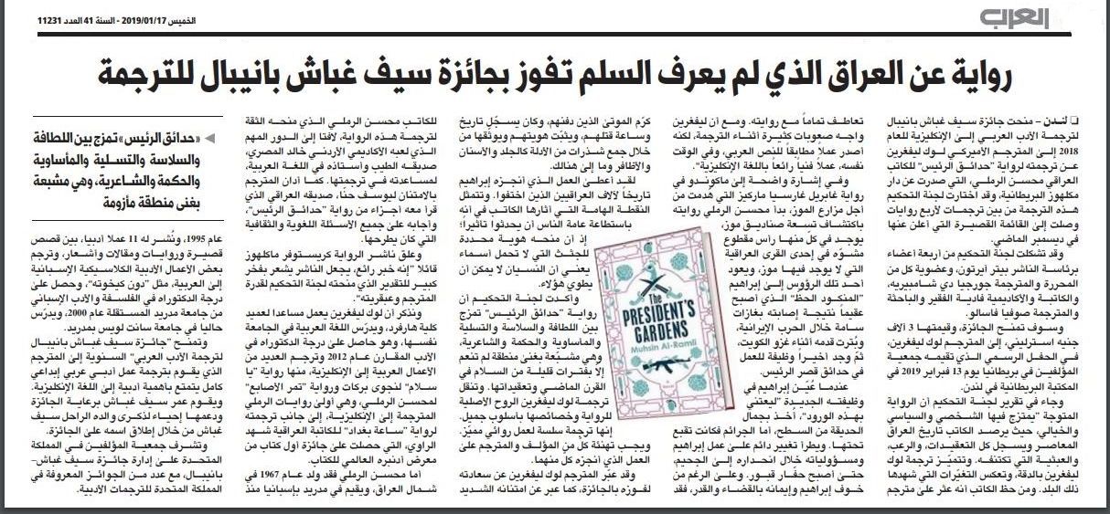 "A seamless rendering ofan outstanding work of fiction"The 2018 Saif Ghobash Banipal Prize for Arabic Literary Translation is awarded to Luke Leafgren for his translation of the novel The President's Gardens by Iraqi author Muhsin Al-Ramli, published by MacLehose Press. The judges chose his translation from the shortlist of four works announced on 10 December 2018. The award of £3,000 will be presented to Luke Leafgren on 13 February 2019 at the Translation Prizes Award Ceremony, organised and hosted by the Society of Authors, at the British Library's Knowledge Centre, along with the other translation prizes being awarded this year. The judging panel comprised publisher and translator Pete Ayrton (chair), editor and translator Georgia de Chamberet, Jordanian author Fadia Faqir, and university lecturer and translator Sophia Vasalou. The prize is administered by Paula Johnson, Head of Prizes and Awards at the Society of Authors.