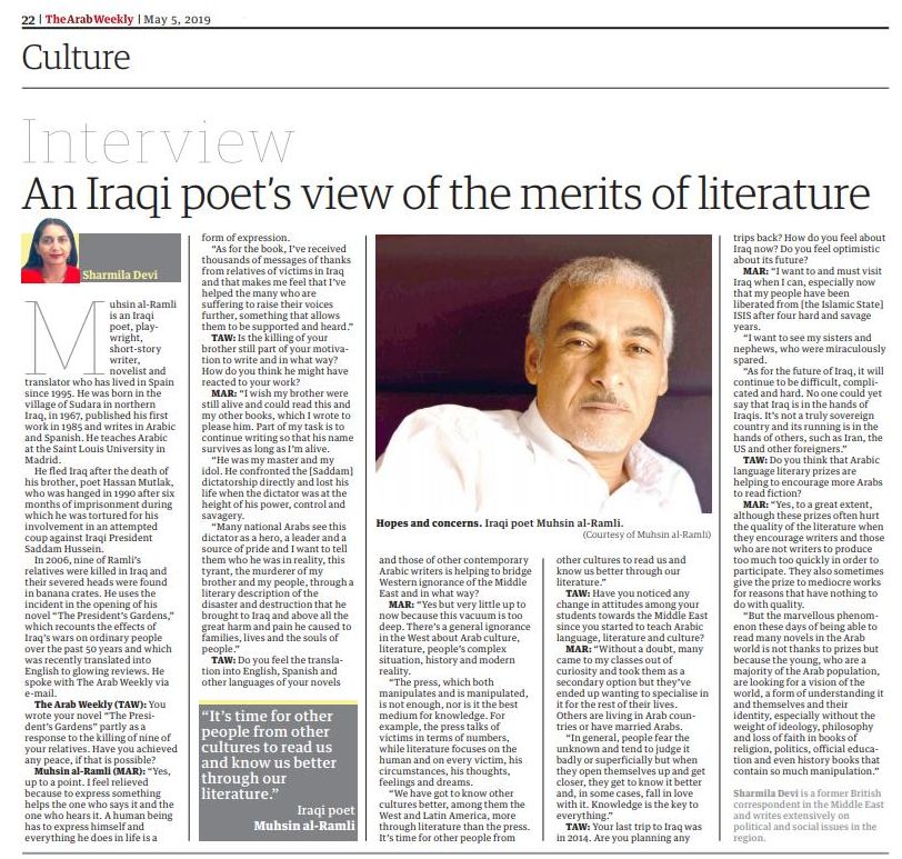 https://thearabweekly.com/iraqi-poets-view-merits-literatureBy: Sharmila DeviThe Arab WeeklyMuhsin Al-Ramli is an Iraqi poet, playwright, short-story writer, novelist and translator who has lived in Spain since 1995. He was born in the village of Sudara in northern Iraq, in 1967, published his first work in 1985 and writes in Arabic and Spanish. He teaches Arabic at the Saint Louis University in Madrid.He fled Iraq after the death of his brother, poet Hassan Mutlak, who was hanged in 1990 after six months of imprisonment during which he was tortured for his involvement in an attempted coup against Iraqi President Saddam Hussein.In 2006, nine of Ramli’s relatives were killed in Iraq and their severed heads were found in banana crates. He uses the incident in the opening of his novel “The President’s Gardens,” which recounts the effects of Iraq’s wars on ordinary people over the past 50 years and which was recently translated into English to glowing reviews. He spoke with The Arab Weekly via e-mail.The Arab Weekly (TAW): You wrote your novel “The President’s Gardens” partly as a response to the killing of nine of your relatives. Have you achieved any peace, if that is possible?Muhsin Al-Ramli (MAR): “Yes, up to a point. I feel relieved because to express something helps the one who says it and the one who hears it. A human being has to express himself and everything he does in life is a form of expression.“As for the book, I’ve received thousands of messages of thanks from relatives of victims in Iraq and that makes me feel that I’ve helped the many who are suffering to raise their voices further, something that allows them to be supported and heard.”TAW: Is the killing of your brother still part of your motivation to write and in what way? How do you think he might have reacted to your work?MAR: “I wish my brother were still alive and could read this and my other books, which I wrote to please him. Part of my task is to continue writing so that his name survives as long as I’m alive.“He was my master and my idol. He confronted the [Saddam] dictatorship directly and lost his life when the dictator was at the height of his power, control and savagery.“Many national Arabs see this dictator as a hero, a leader and a source of pride and I want to tell them who he was in reality, this tyrant, the murderer of my brother and my people, through a literary description of the disaster and destruction that he brought to Iraq and above all the great harm and pain he caused to families, lives and the souls of people.”TAW: Do you feel the translation into English, Spanish and other languages of your novels and those of other contemporary Arabic writers is helping to bridge Western ignorance of the Middle East and in what way?MAR: “Yes but very little up to now because this vacuum is too deep. There’s a general ignorance in the West about Arab culture, literature, people’s complex situation, history and modern reality.“The press, which both manipulates and is manipulated, is not enough, nor is it the best medium for knowledge. For example, the press talks of victims in terms of numbers, while literature focuses on the human and on every victim, his circumstances, his thoughts, feelings and dreams.“We have got to know other cultures better, among them the West and Latin America, more through literature than the press. It’s time for other people from other cultures to read us and know us better through our literature.”TAW: Have you noticed any change in attitudes among your students towards the Middle East since you started to teach Arabic language, literature and culture?MAR: “Without a doubt, many came to my classes out of curiosity and took them as a secondary option but they’ve ended up wanting to specialise in it for the rest of their lives. Others are living in Arab countries or have married Arabs.“In general, people fear the unknown and tend to judge it badly or superficially but when they open themselves up and get closer, they get to know it better and, in some cases, fall in love with it. Knowledge is the key to everything.”TAW: Your last trip to Iraq was in 2014. Are you planning any trips back? How do you feel about Iraq now? Do you feel optimistic about its future?MAR: “I want to and must visit Iraq when I can, especially now that my people have been liberated from [the Islamic State] ISIS after four hard and savage years.“I want to see my sisters and nephews, who were miraculously spared.“As for the future of Iraq, it will continue to be difficult, complicated and hard. No one could yet say that Iraq is in the hands of Iraqis. It’s not a truly sovereign country and its running is in the hands of others, such as Iran, the US and other foreigners.”TAW: Do you think that Arabic language literary prizes are helping to encourage more Arabs to read fiction?MAR: “Yes, to a great extent, although these prizes often hurt the quality of the literature when they encourage writers and those who are not writers to produce too much too quickly in order to participate. They also sometimes give the prize to mediocre works for reasons that have nothing to do with quality.“But the marvellous phenomenon these days of being able to read many novels in the Arab world is not thanks to prizes but because the young, who are a majority of the Arab population, are looking for a vision of the world, a form of understanding it and themselves and their identity, especially without the weight of ideology, philosophy and loss of faith in books of religion, politics, official education and even history books that contain so much manipulation.”