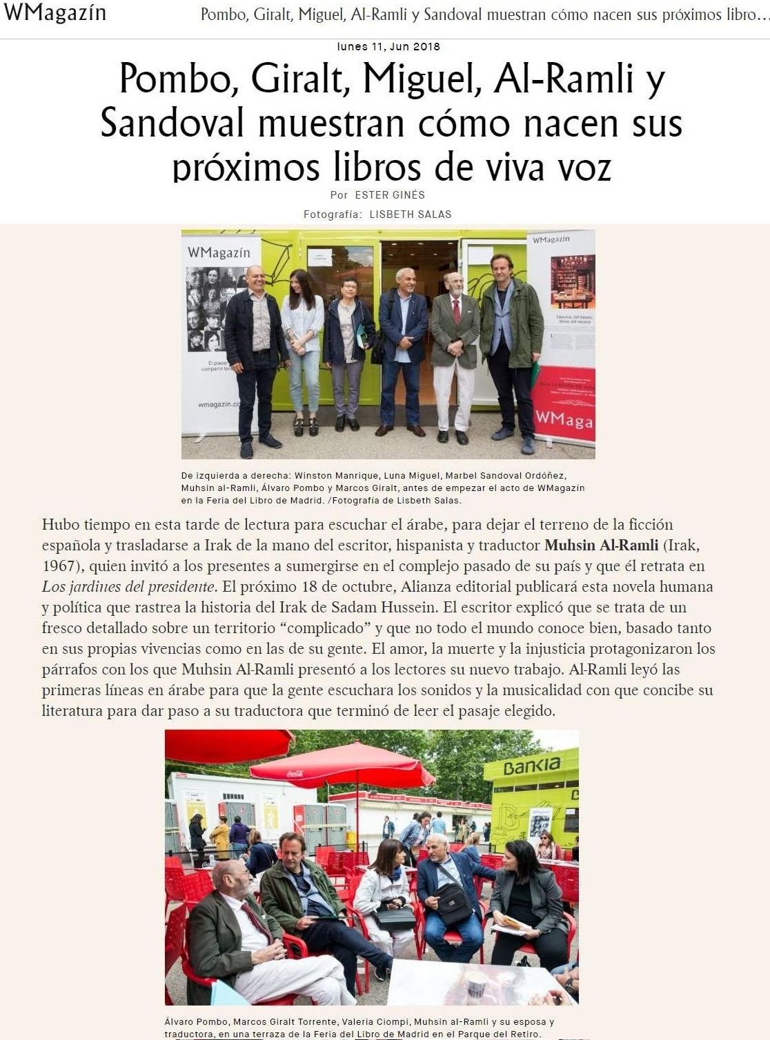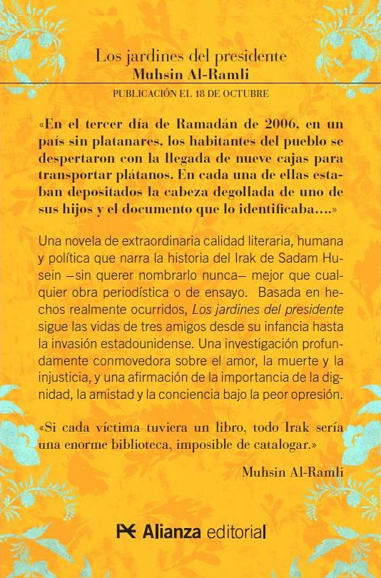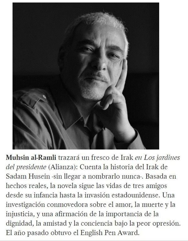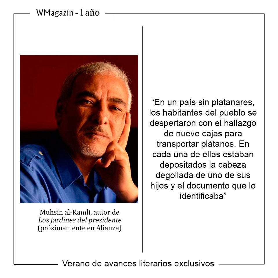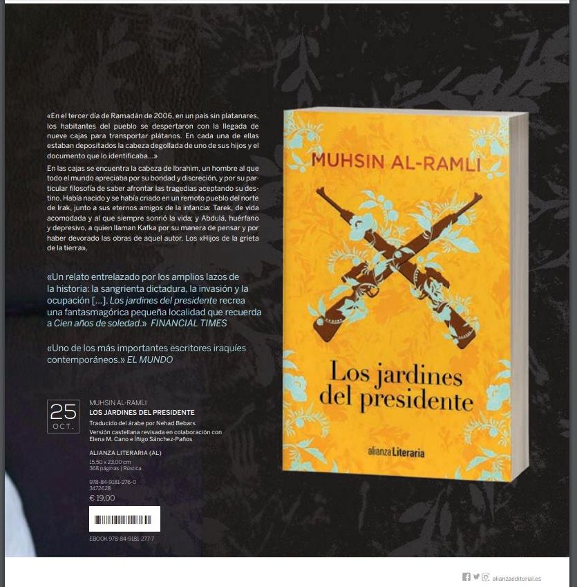 (Alianza), la novela con la cual el narrador y dramaturgo iraquí Muhsin Al-Ramli cuenta la historia de hechos reales del Irak de Sadam Hussein y con la cual obtuvo el English Pen Award. Una obra que llegará a las librerías el 25 de octubre y que incluimos en nuestro especial Veranos de Avances Literarios Exclusivos con la lectura de viva voz de su autor y un pasaje del texto.Los jardines del presidente es una de las obras que protagonizarán la temporada otoño-invierno y que se une a esta biblioteca de WMagazín de la que ya forman parte Álvaro Pombo y su Retrato del vizconde en invierno (Destino) y del investigador Danny Orbach Las conspiraciones contra Hitler(Tusquets), Marcos Giralt Torrente con Mudar de piel (Anagrama) y Mircea Cartarescu con Cegador I: El ala izquierda (Impedimenta). Más adelante será el turno de autores como Gabriel García Márquez, María Zambrano, Rodrigo Rey Rosa…