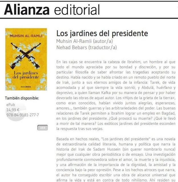 https://www.ideal.es/culturas/libros/irak-tragedia-mundo-20181116193723-ntrc.htmlMuhsin Al-Ramli, exiliado en España, relata el drama de su país, que no ha conocido la paz en 40 años, en el libro 'Los jardines del presidente'