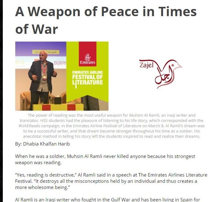 http://zajelzu.ae/2018/04/01/weapon-peace-times-war/The power of reading was the most useful weapon for Muhsin Al-Ramli, an Iraqi writer and translator. HSS students had the pleasure of listening to his life story, which corresponded with the #UAEReads campaign, in the Emirates Airline Festival of Literature on March 8. Al-Ramli’s dream was to be a successful writer, and that dream became stronger throughout his time as a soldier. His anecdotal method in telling his story left the students inspired to read and realize their dreams.By: Dhabia Khalfan HaribWhen he was a soldier, Muhsin Al-Ramli never killed anyone because his strongest weapon was reading.“Yes, reading is destructive,” Al-Ramli said in a speech at The Emirates Airlines Literature Festival. “It destroys all the misconceptions held by an individual and thus creates a more wholesome being.”Al-Ramli is an Iraqi writer who fought in the Gulf War and has been living in Spain for the past 23 years. He is best known for the complete translation of Don Quixote from Spanish to Arabic. ZU students from the College of Humanities and Social Sciences had the pleasure of attending Al-Ramli’s speech among the three different sessions on March 8.