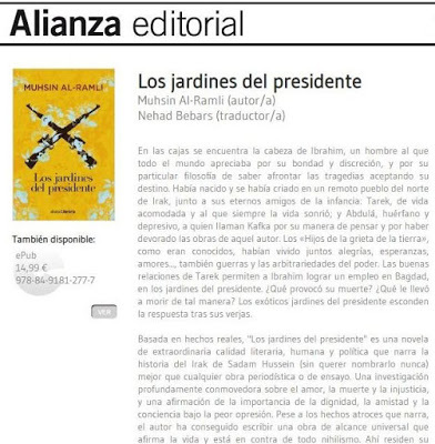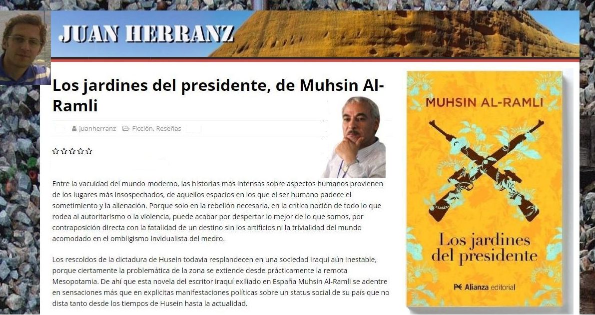 https://www.juanherranz.com/libro-los-jardines-del-presidente/Juan HerranzEntre la vacuidad del mundo moderno, las historias más intensas sobre aspectos humanos provienen de los lugares más insospechados, de aquellos espacios en los que el ser humano padece el sometimiento y la alienación. Porque solo en la rebelión necesaria, en la crítica noción de todo lo que rodea al autoritarismo o la violencia, puede acabar por despertar lo mejor de lo que somos, por contraposición directa con la fatalidad de un destino sin los artificios ni la trivialidad del mundo acomodado en el ombligismo invidualista del medro.Los rescoldos de la dictadura de Husein todavía resplandecen en una sociedad iraquí aún inestable, porque ciertamente la problemática de la zona se extiende desde prácticamente la remota Mesopotamia. De ahí que esta novela del escritor iraquí exiliado en España Muhsin Al-Ramli se adentre en sensaciones más que en explicitas manifestaciones políticas sobre un status social de su país que no dista tanto desde los tiempos de Husein hasta la actualidad.La trama en sí nos conduce a una apasionada historia de amistad, con fundamentos reales, entre Ibrahim, Tarek y Abdulá. La infancia de los tres compone un mosaico de esa felicidad inalcanzable de los niños criados en tiempos de conflicto. Y ese poso de amistad indisoluble mueve la historia cuando ya son adultos dentro de un país que sigue sumido en los mismos cimientos sobre las movedizas tierras del enfrentamiento.Tarek ha sabido encontrar su sitio en esa sociedad iraquí y desde su posición más cómoda consigue un buen trabajo para Ibrahim. Pero lo que parecía un buen comienzo pronto acaba como un macabro final que se lleva por delante al Ibrahim hombre y a su imborrable recuerdo para un Tarek que indagará hasta la saciedad para conocer los motivos de esa muerte tremebunda en los mismos jardines del presidente.Con unas notas del surrealismo que supone afrontar la tragedia más aviesa, en torno a las ideas del tercer amigo, Abdulá, nos adentramos en una historia de extremos, de polos opuestos entre la amistad y el odio, entre la fatalidad y la vaga idea de una posible superación de todo conflicto desde la toma de conciencia más lúcida, para bien o para mal.