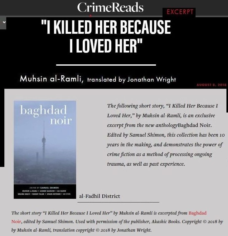 __________________________________The short story “I Killed Her Because I Loved Her” by Muhsin Al-Ramli is excerpted from Baghdad Noir, edited by Samuel Shimon. Used with permission of the publisher, Akashic Books. Copyright © 2018 by by Muhsin Al-Ramli, translation copyright © 2018 by Jonathan Wright. http://www.akashicbooks.com/catalog/baghdad-noir/