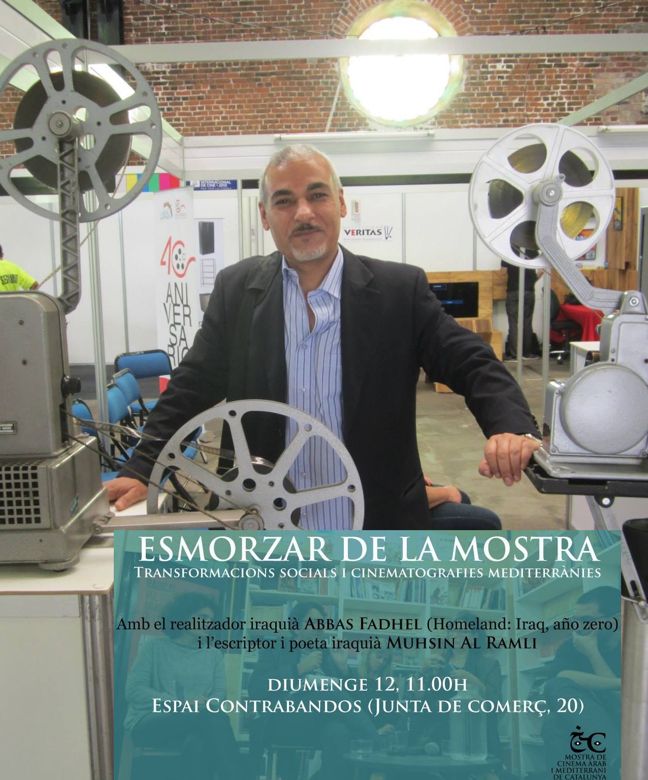 Avui ha tingut lloc un esmorzar emmarcat en la Mostra de Cinema Àrab i Mediterrani de Catalunya amb el director de cinema Abbas Fahdel (Babilònia, Iraq) i el poeta Muhsin Al-Ramli (Iraq, 1967), a l’Espai Contrabandos. L’acte, titulat “Transformacions socials i cinematografies mediterrànies”, volia reflexionar sobre el paper de l’art i la cultura en la transformació social i la situació actual del país, retratat a la nova pel·lícula de Fahdel, “Homeland: Iraq any zero“. I als molts llibres de novel·la i poesia de Ramli.Els dos artistes han començat, precisament, destacant que, tot i que fa més de 20 anys que no hi viuen, a la seva obra només poden parlar del seu país natal. “Per registrar el dolor“, ha explicat Ramli, perquè “és el que hi ha”. Tot aquest temps ha viscut a l’Estat espanyol, però afirma que, quan escriu, “em surt Iraq”. Fahdel, que viu a París des dels 18 anys, ho ha corroborat i ha explicat que, així, se senten “més útils”.