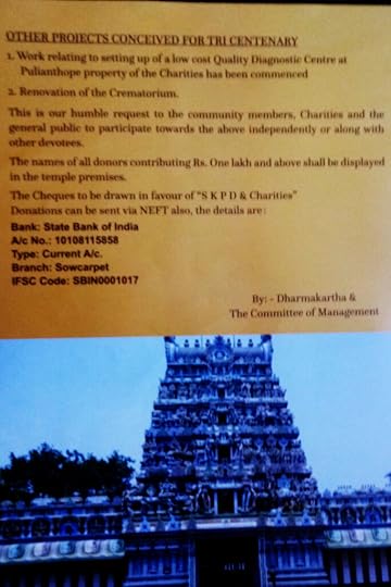 I received a Kumbabhishekam Appeal pamphlet from SKPD via post. The images you see in this post are pages from that pamphlet. It’s basically an appeal for donations as the Temple management is planning to conduct the Kumbabhishekam this year, along with the tri-centenary celebrations.
