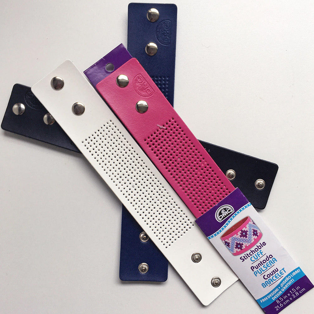 DMC has introduced these new stitchable faux leather wrist cuffs and they are so much fun to work with. They come in four colors and are punched with holes and ready to stitch up with the design included, or one of your own! Although the dot grid is designed for Straight or Cross stitches, you can easily use some of your favorite hand embroidery stitches as well. I’ve used French Knots and Lazy Daisies in addition to Straight stitches for this design and I love how it turned out.
