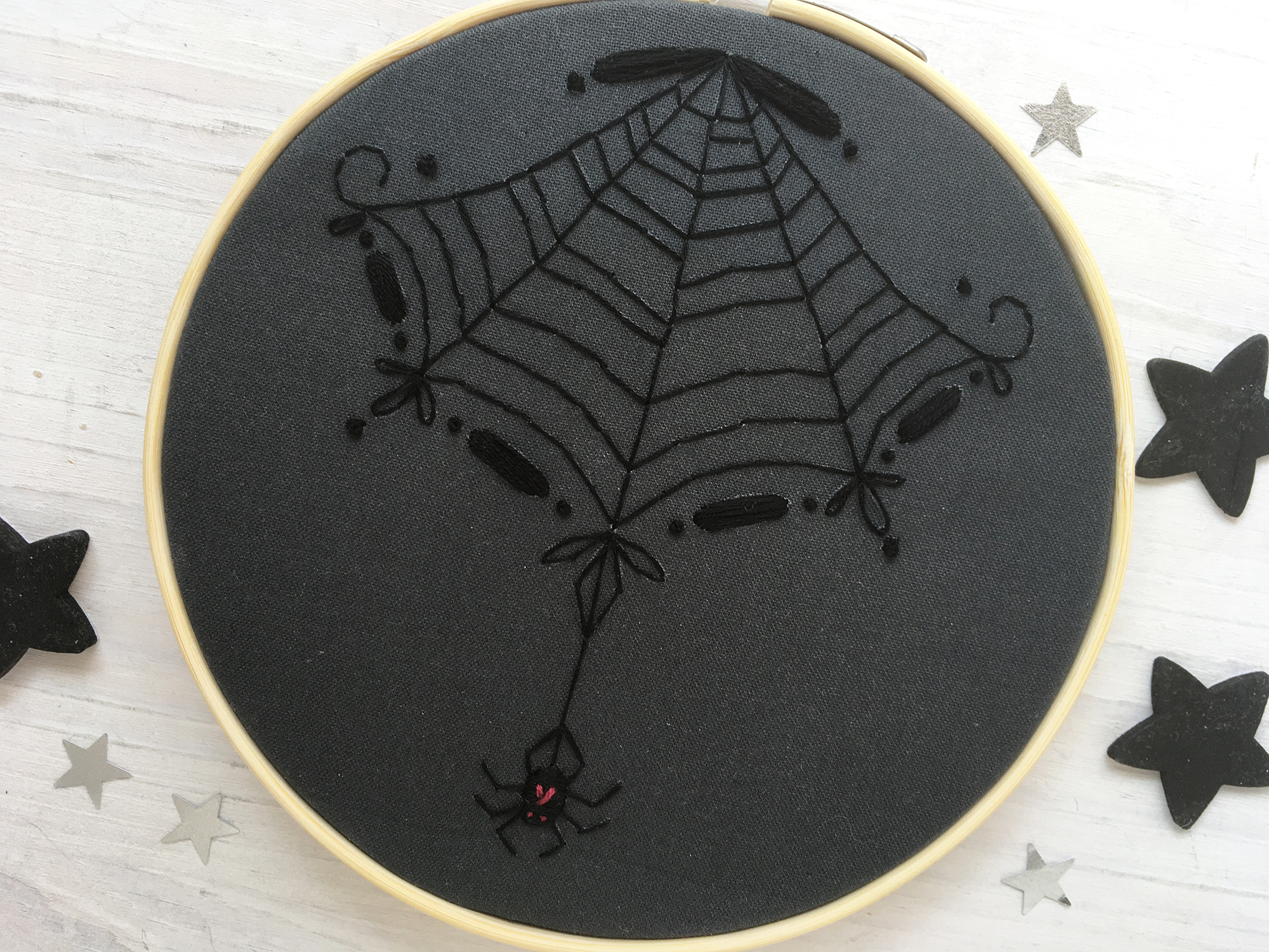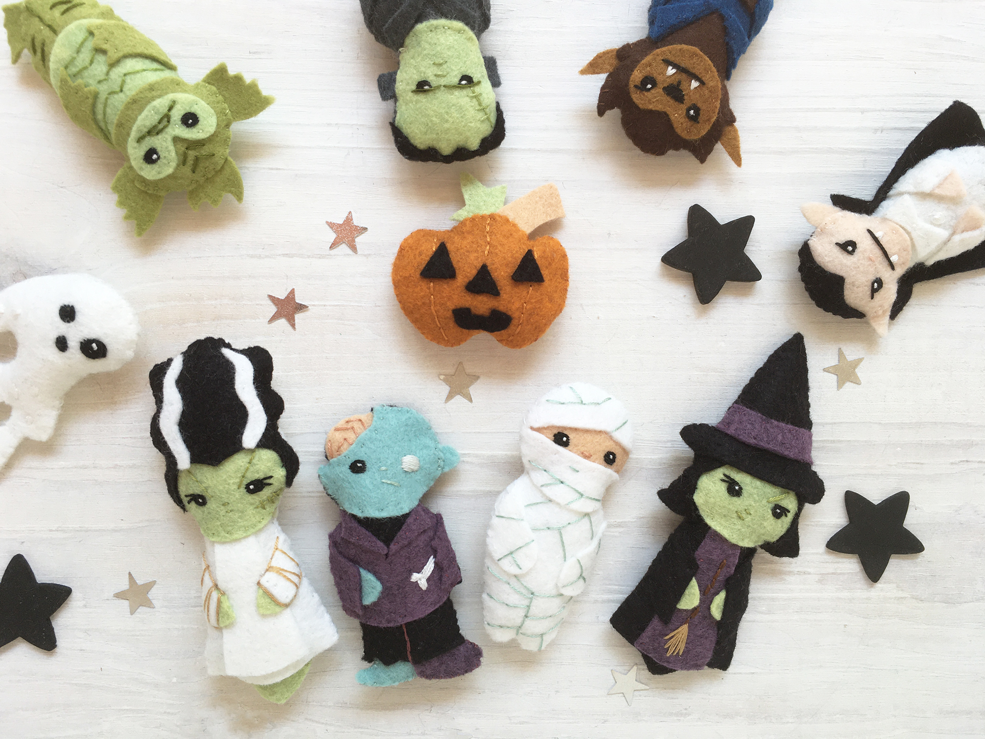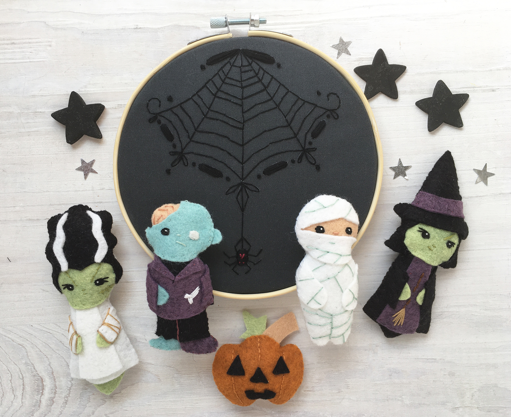 These fun, felt Classic Movie Monsters and elegant, black on black Spider Web embroidery sampler are coming to little dear Patreon subscribers in October.