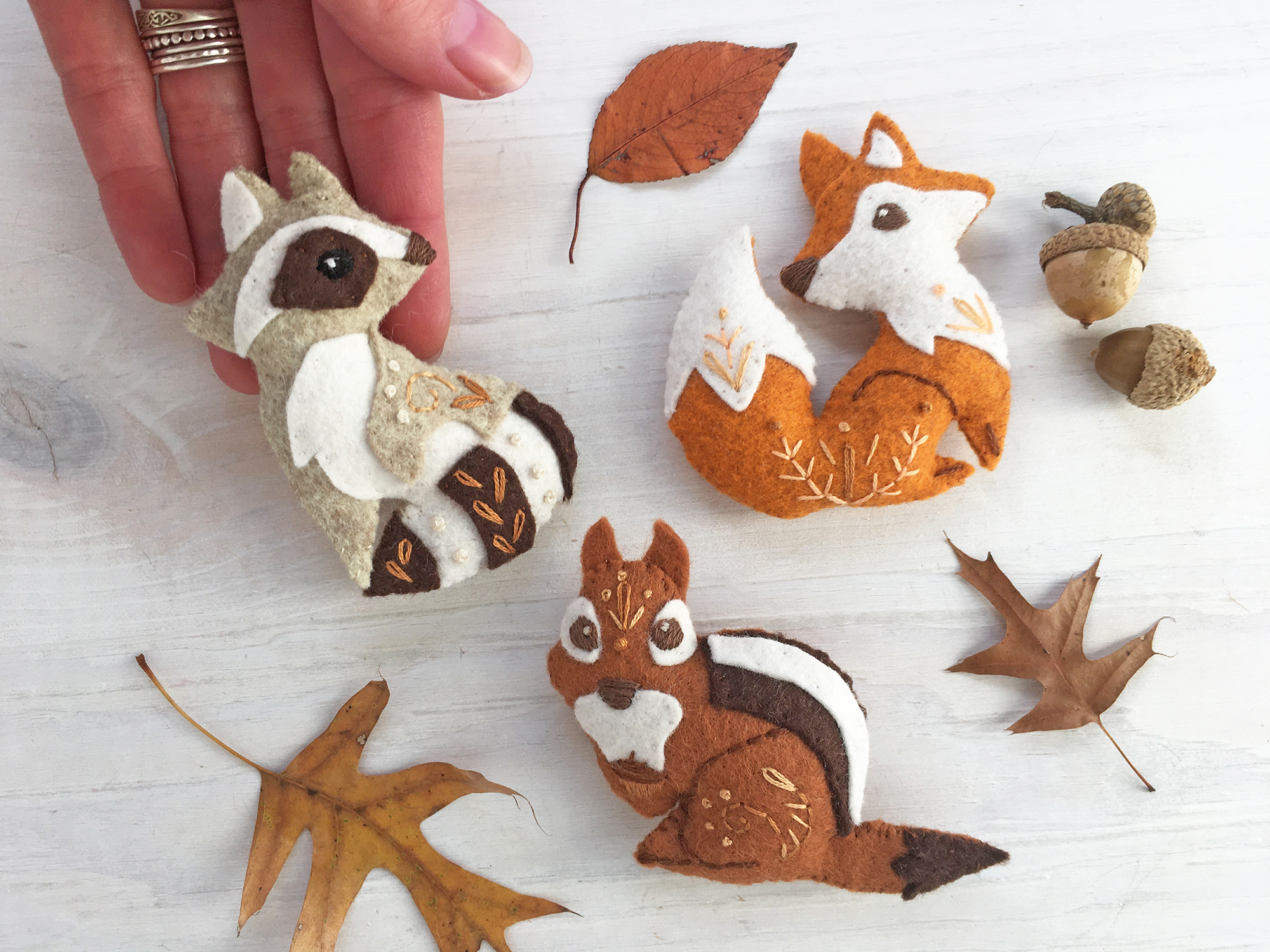 Felt Friends subscribers are getting the pattern for this sweet trio, Raccoon, Fox and Chipmunk! Although these are new pattern designs, I have done a simpler felt fox and raccoon before (you can see those in my Etsy shop) But they are some of my all time favorite animals and I wanted to do up some new, fancier versions. The Chipmunk is an all new animal in my menagerie, and also a big fave of mine! They are so much fun to watch. All three of these cuties appear in my real life neighborhood regularly, and I feel so lucky to have such magical nature around me.