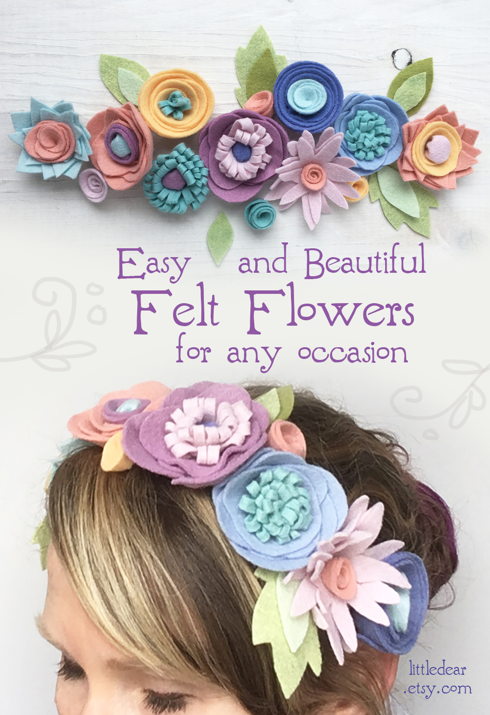 Felt flowers are perfect in any color palette, for any occasion! You'll love creating garlands, mobiles, bouquets or flower crowns with this easy pattern and instructions.Find both pattern downloads now at littledear.etsy.com