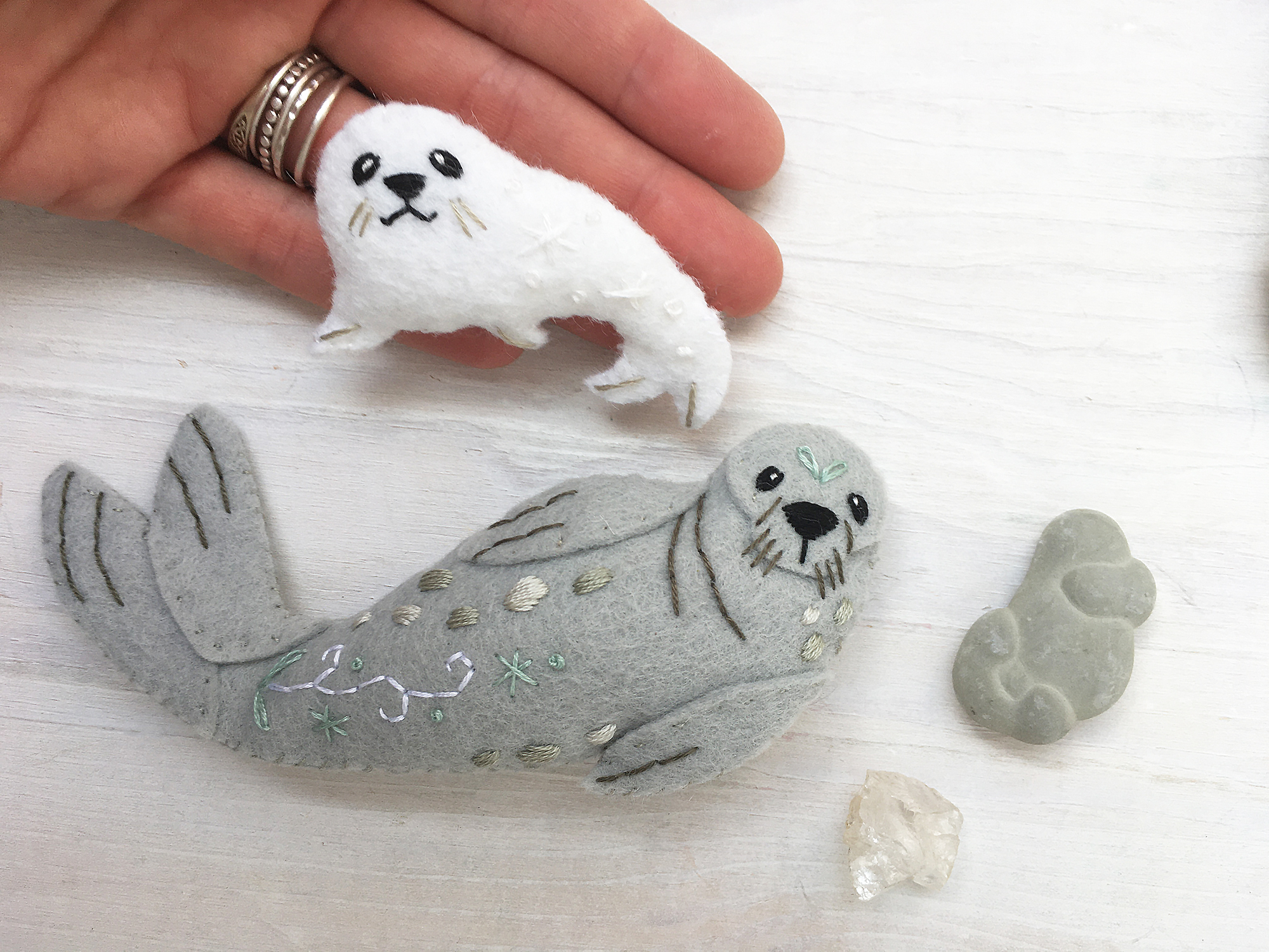 First up, felt "Coastal Creatures" puffin, seagull, otter and seals will be coming to the Felt Friends club. I really like how these guys turned out. Just a little bit wintery, they're perfect for getting a head start on your Holiday ornaments!