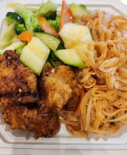 I opted for a bottle of water, as the Thai iced tea was expensive, and I was not unrewarded. On getting to my seat, I said a prayer, and chopsticked some noodles into my mouth, had a few veggies, and then, the fish. The breading was peppered nicely, the fish juicy and delicious.