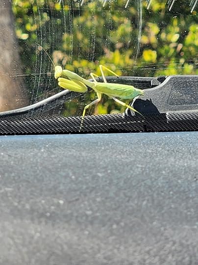 I walked to the library parking lot to stash the books in my trunk, and as I got into the car, I saw a preying mantis on my windshield, and after photographing it and taking in the wonder of it all, I got a piece of bark, and eased it back into the lot’s desert grasses area, not wanting it to my new friend to lose its’ hitch when I got on the freeway.