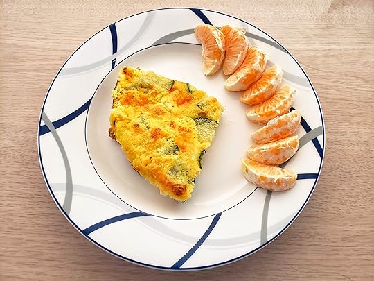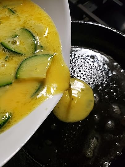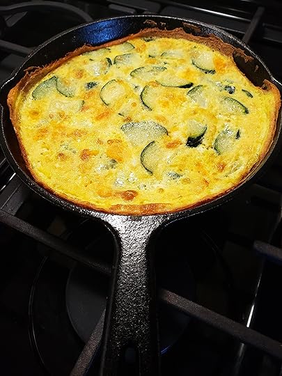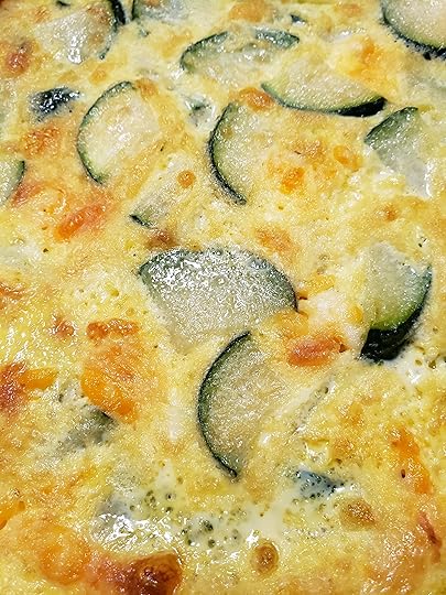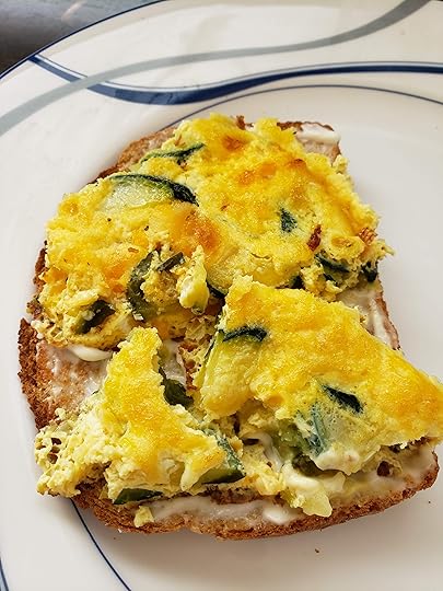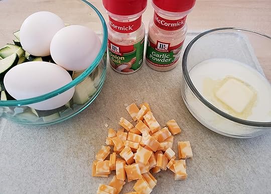 3 large eggs (jumbo cage free eggs are kinder, and while more pricey, actually taste better as well)1 Zucchini, quartered and sliced1 Tablespoon melted butter1/3 up milk2 Slices Tillamook Colby Jack cheese, diced (grated Swiss/Parmesano/Romano would also work nicely)2-3 shakes McCormick Garlic Powder (fresh garlic is better)1-2 shakes McCormick Onion Salt (1 fresh onion, diced is better)1-3 Teaspoons olive oil1-3 sprays, olive oil spray
