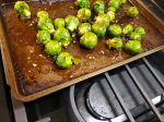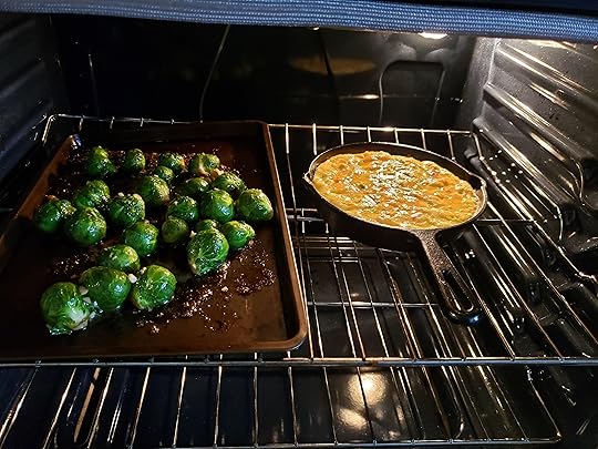 I washed and drained the Brussels sprouts. Mixing the ingredients well in a bowl, I poured them onto the baking sheet1, leaving some of the mixture in the bowl to recoat with a brush at intervals during baking. The oven temperature used was 350℉, and as I was solidifying a fritatta on the cooktop before baking, I let the sprouts sit in the oven as it warmed up. 15 minutes or so later, the fritatta was only fractionally runny2, so I added it to the now warmed up oven, and ran the oven for 25 minutes.