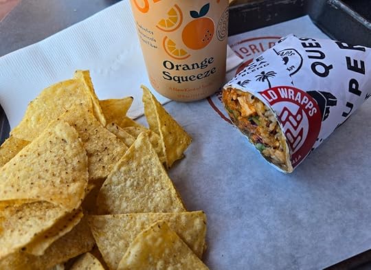 We went to World Wrapps for lunch, and I had the (chicken) Tikki Masala wrap with meat, brown rice/quinoa, slaw, pickles, cilantro, pumpkin seeds, yogurt, and Masala sauce on flatbread.