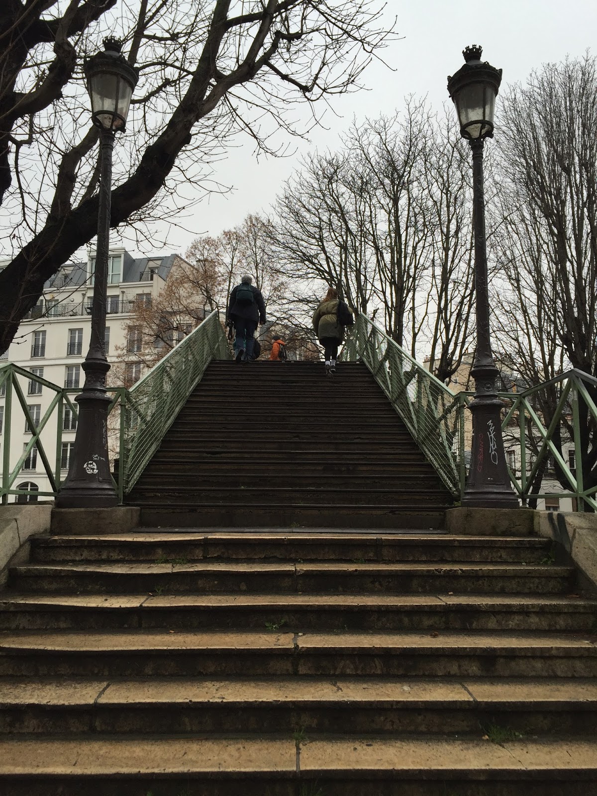 They also had to take photos: rows of victorian apartments line the canal; arching iron bridges, their steps overgrown with lichen, criss-cross its expanse. Picturesque any time of year, somber in the winter morning drizzle. In spring and summer this canal is a gorgeous place to hang out, reminiscent of Lake Austin, with runners, picnickers, and sunbather lining the stony banks. Youth on display. However, Paris shuts down the canal every few years for cleaning. You wouldn't believe the gunk-covered treasures deposited at the bottom of a canal: wine bottles (it's France), shopping carts, a bike with child's seat, a scooter, a 7-foot tall inflatable dinosaur (!), and I can say this without exaggerating, a kitchen sink. Talk about photo opps and fodder for a fiction writer. How did a dinosaur and a scooter wind up side-by-side at the bottom of the canal? In my mind this idea spun strange tales of a New Years Eve gone completely off the rails. Maybe over the rails of a bridge. Pun intended and not rescinded. Ah, yes. The folly of youth on display.
