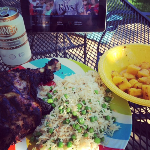 #raysbaseball #jerk chicken, grilled #mango, #coconut #rice, #Pinner #beer Yum #whatsfordinner