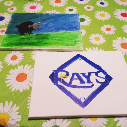 An afternoon of painting with Gina. Guess which painting is whose? #raysbaseball #painting #sheep