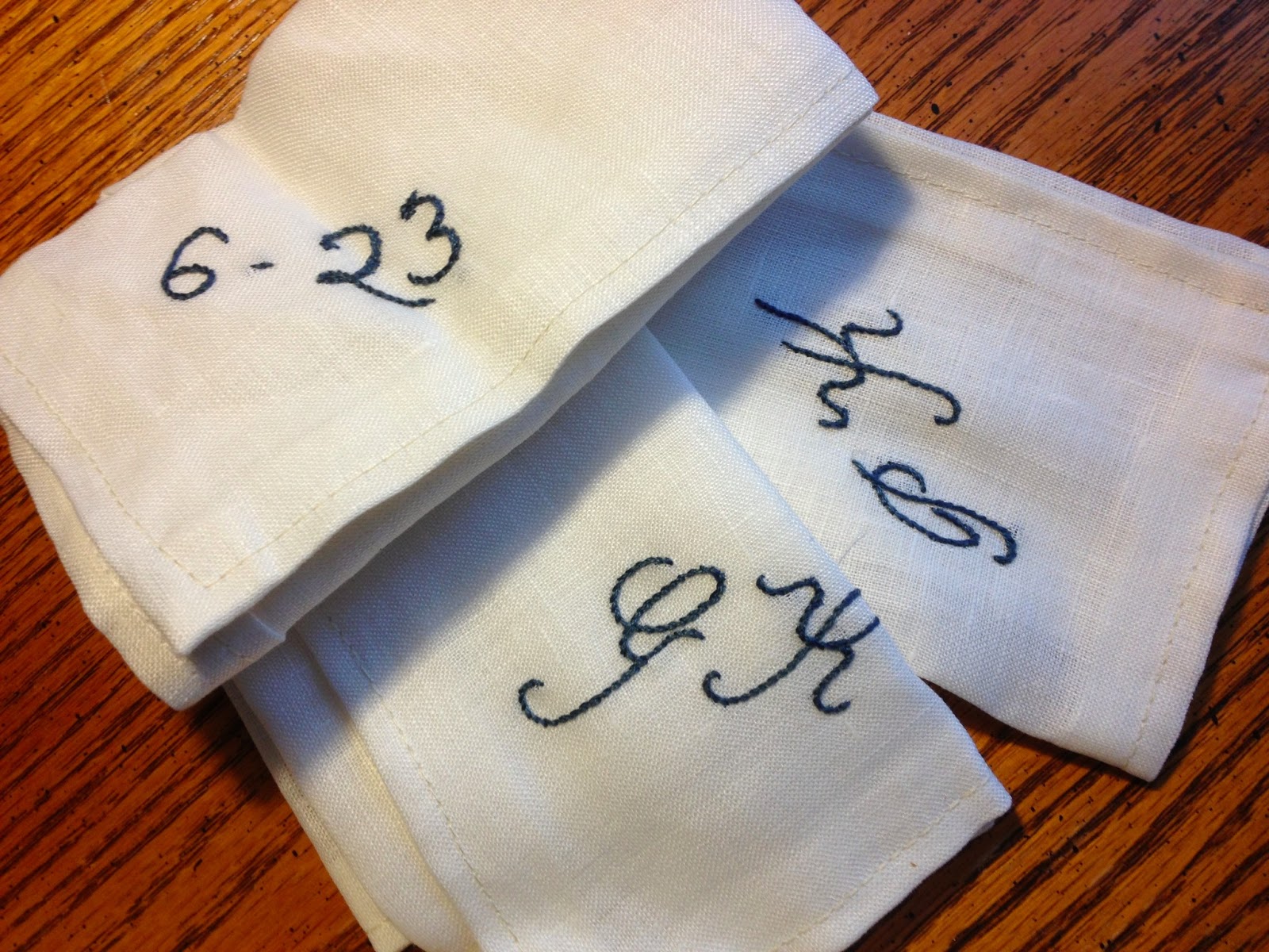 For linen, she bought me these embroidered handkerchiefs. Two of them feature our initials and one features our anniversary date. Wonderful!