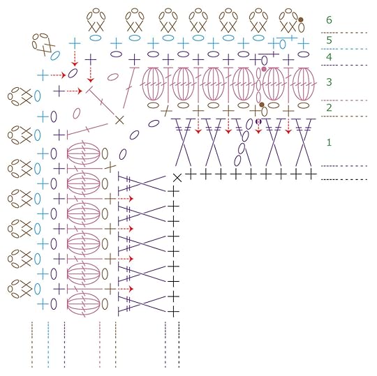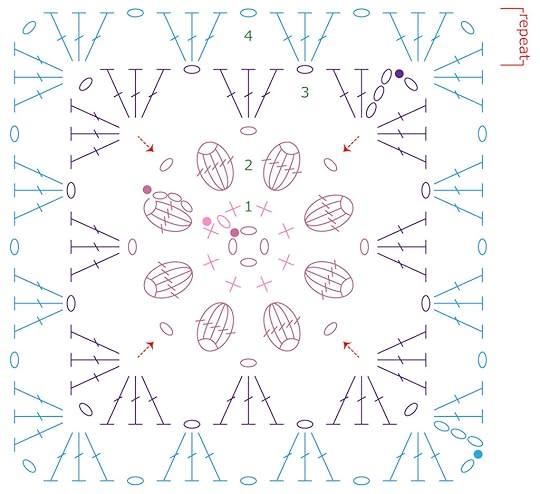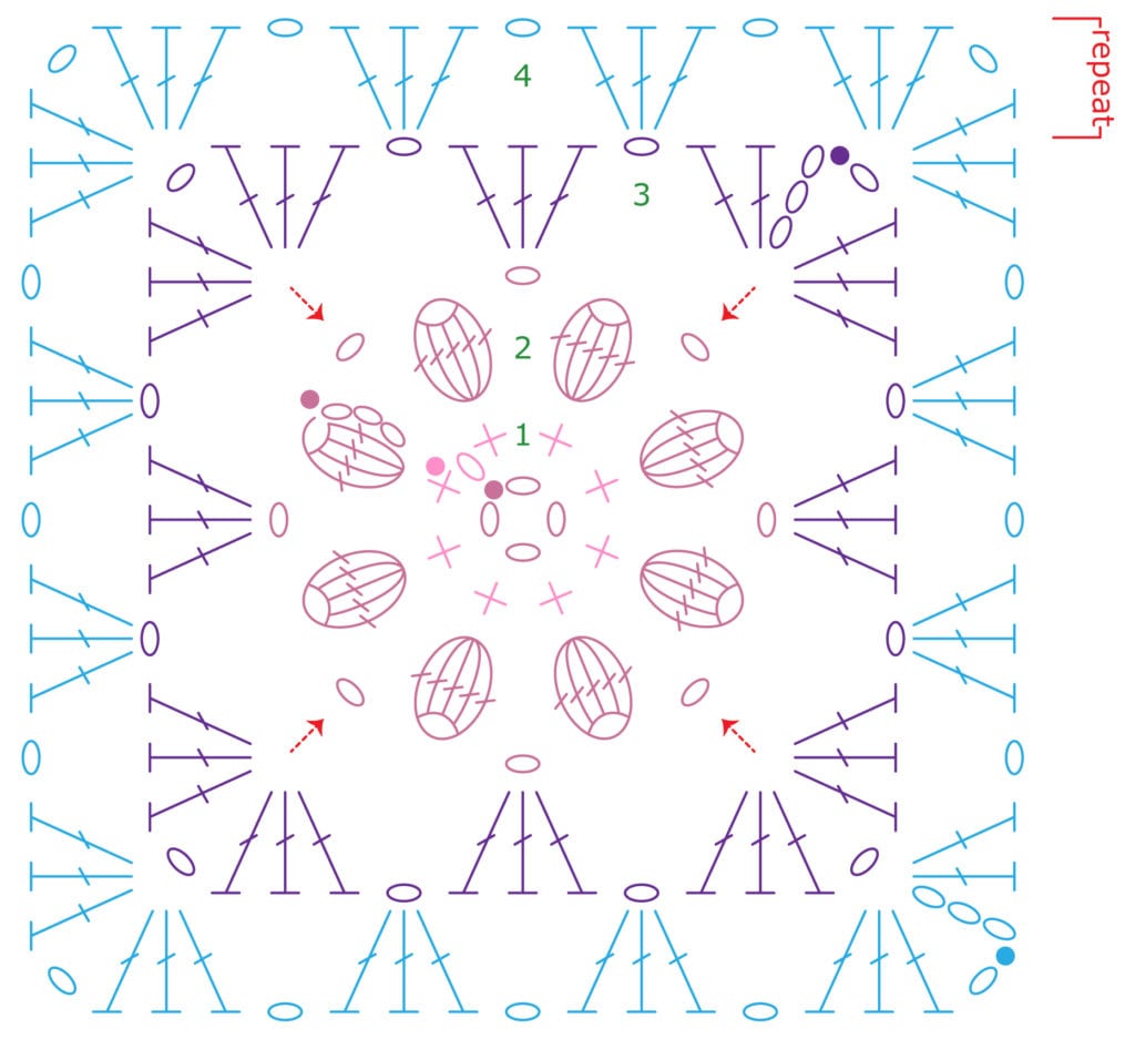 For this chart you will notice there are only 4 rounds shown. To continue the pattern you will repeat round 4 placing 3 dc in each ch-1 space along the sides and placing (3 dc, ch 1, 3 dc) in the ch-1 at the corners