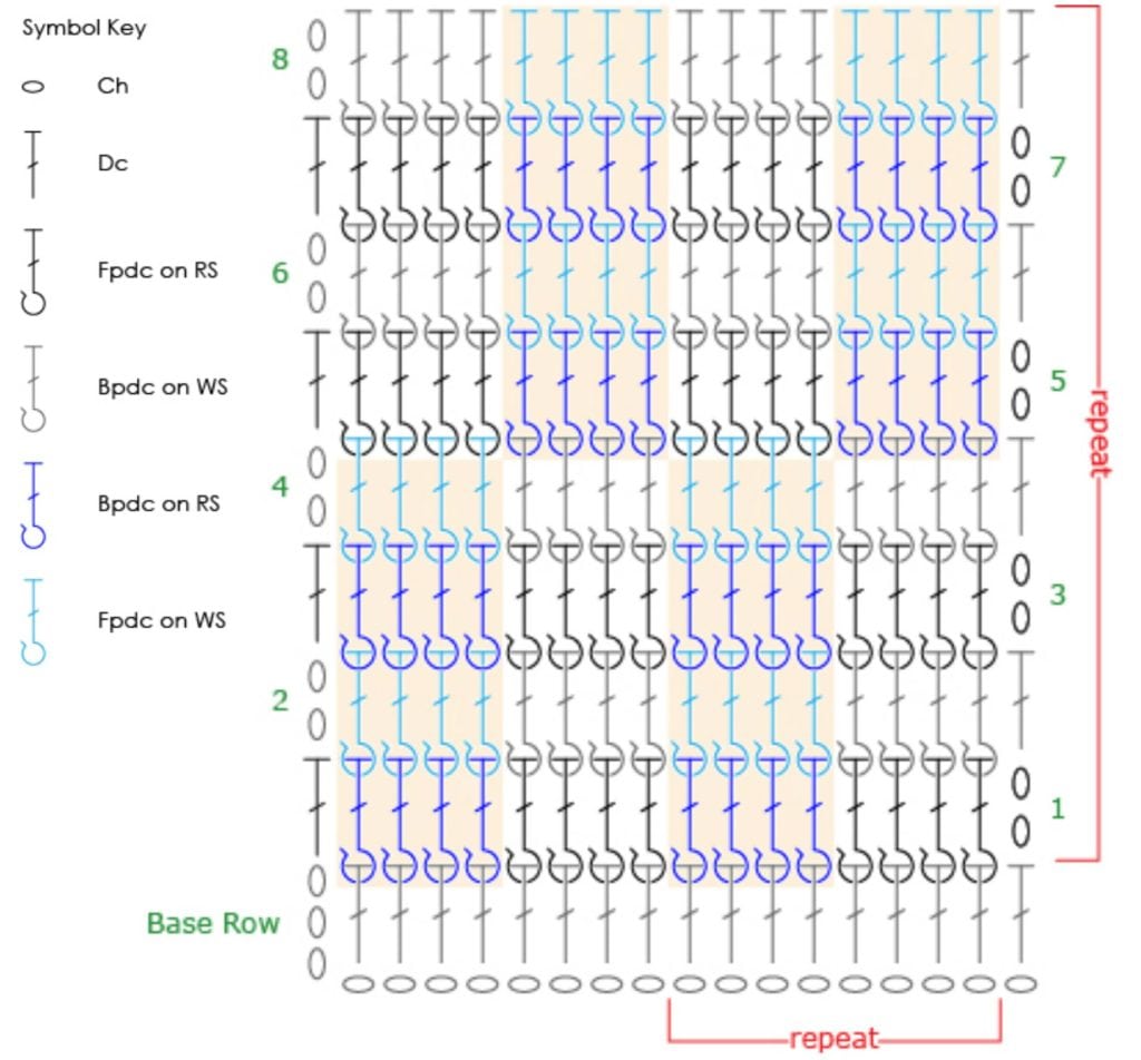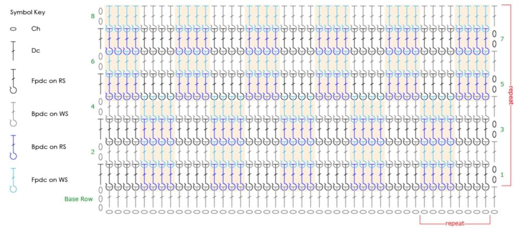 Each of the charts provided in this pattern are written with the same number of foundation chain stitches as the ‘in class block’. I did this so that you have a full chart that allows you to see exactly what stitches go where for the entire swatch.