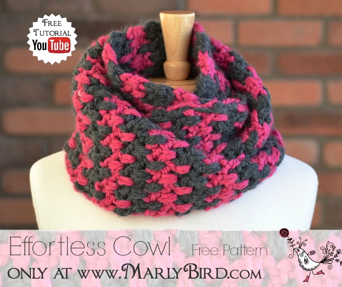 Effortless Free Crochet Cowl Pattern! Made with one skein of super bulky yarn in each color and a large crochet hook it is a quick, fun and fast project. From the moment I finished this project I’ve wanted to wear it 24/7. As a matter of fact, I did wear it out the same day I finished it and received a TON of compliments.