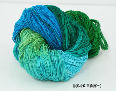 The yarns are of three categories: Ribbon, Hand-spun and Fabric Strips. Ribbon is created by torn silk saris with the edges are sewn together. Some is kept in the orignal colors, some of the colors can be stripped and overdyed to acheive another brilliant, multitonal yarn. Hand-spun might be silk remnants including banana fiber, hemp, newspaper which is hand-spun generally by drop spindle and the Fabric Strips are mechanically spun but hand-dyed.