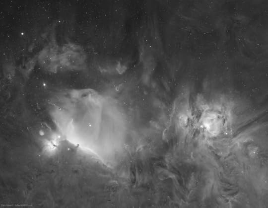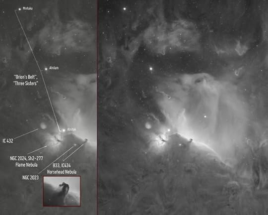 Orion Core in hydrogen-alpha: two-panel mosaic of Orion’s Belt, the Horsehead Nebula, and M42, the Orion Nebula–and everything going on around these. This is a big chunk of space and the center of the Constellation Orion. The three bright stars in a line on the left is Orion’s Belt. ZWO ASI2600MM-Pro, 3nm Ha, William Optics SpaceCat51 Apo refractor. My astro stuff here: https://SaltwaterWitch.com