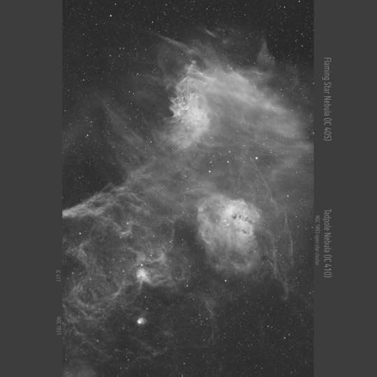 Flaming Star Nebula (IC 405, SH 2-229, Caldwell 31) and the Tadpole Nebula (IC 410) in the constellation Auriga, along with the two bright areas of emission toward the bottom, the “Spider and Fly”, IC 417 and NGC 1931. 42 x 300-second subs in hydrogen-alpha.