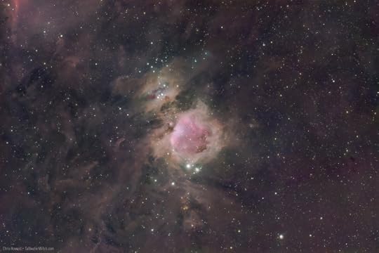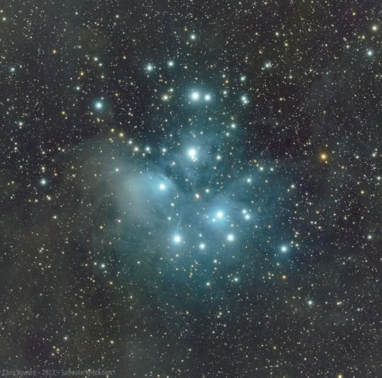 The Pleiades, M45, also called the Seven Sisters, is a very bright and distinct open star cluster in Taurus, surrounded by the reflection nebula NGC 1432 (most of that pale blue interstellar dust and cloudiness). The Seven Sisters are very hot blue stars about 444 lightyears away. Where I am in the northern hemisphere, around 43° latitude, the Pleiades rises in the night sky in October, peaks in January at almost 50° in the southern sky, before sinking below the horizon by the end of March—and then we don’t see it in the night sky again until late autumn.