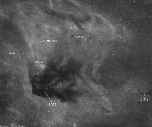 Dark nebula Dobashi 2961, et al. below the North America Nebula, 3 nanometer hydrogen-alpha. 52 x 300 second exposures stacked in DSS. #ZWO ASI1600MM-Pro mono camera. This one didn’t make it into the Spring 2023 video because I didn’t have time to process the data.