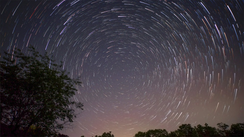 A star trails view of the NCP (North Celestial Pole) from my backyard, five hours of 15-second exposures stacked together to show the Earth’s rotation. That star in the middle is the North Star, Polaris, the star at the end of the handle in the Little Dipper asterism. Polaris is very close to the NCP, only 4 degrees off the actual point in space that marks our planet’s North Celestial Pole. Basically, if you’re standing in a fixed position on the surface (say, in coastal New Hampshire at around 43° latitude) and draw an imaginary line along Earth’s axis of rotation, out into space, until you reach a single point in space–that’s the celestial pole, and from your perspective, all stars will rotate around that point. In the southern hemisphere, looking south, you have the SCP, South Celestial Pole, which doesn’t have a bright star in close proximity–so imagine this image without that bright point of light in the center.