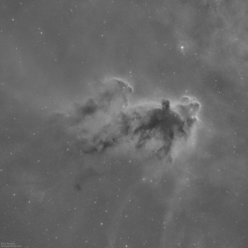 Narrowband Boogeyman in Orion - Sure, we’re a few days late for halloween, but check out the creepiness of the dark molecular cloud LDN1622, the “Boogeyman Nebula” about 500 lightyears away in the constellation Orion, along with a bright lumpy backdrop of nebulosity lit from above by the variable star 56 Orionis. LDN1621 is the dark nebula to the left of the Boogeyman, and the reflection nebula VdB 62 is just to the right. The uneven cloudiness at the top right is a small section of Barnard’s Loop (Sh2-276), which may give you an indication of LDN1622’s location, on the other side of the Loop from M78, about halfway up one side of Orion. Notes: 36 x 8-minute exposures, almost five hours of data in hydrogen-alpha (Antlia 3nm Ha Pro filter), William Optics GT81 Apochromatic refractor 382mm FL at f/4.7, ZWO ASI1600MM-Pro mono camera cooled to -10C.