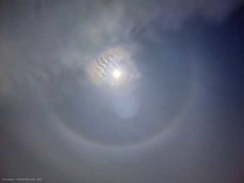 A shot from last night with the iPhone, a 22° halo around the moon–sometimes called a “winter halo”, formed by reflected sunlight (moonlight) passing through ice crystals suspended in the atmosphere.
