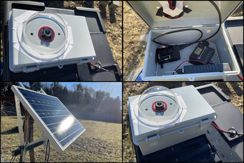 All Sky Cam with solar charging–testing the new continuous operation system, charge batteries during the day, take pics all night: ZWO ASI120MC camera, 6mm lens, Raspberry Pi 3b, 12v lithium battery, 10 amp solar controller. Astro blog: https://SaltwaterWitch.com