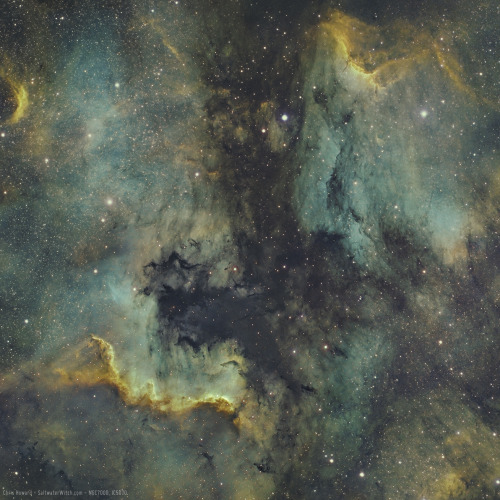 Another one of the North America Nebula (NGC 7000, left) and Pelican Nebula (IC 5070, top right) in the constellation Cygnus. Narrowband in the SHO palette. 68 x 240 second subs in Ha, OIII, SII. I kept the Hydrogen (green) levels pretty even.