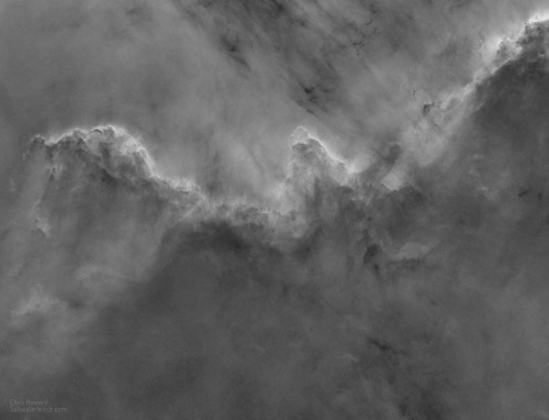 The “Cygnus Wall” in the North America Nebula (NGC 7000, Caldwell 20) in the constellation Cygnus. William Optics GT81 Refractor, Astronomik 6nm Ha filter, ZWO ASI1600MM-Pro monochrome camera. Although not a lot of stars in the field of view, I used StarNet to remove them.
