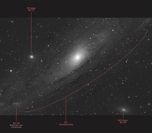 Here’s M31, the Andromeda Galaxy without any stars from our galaxy, the Milky Way. The two bright objects orbiting Andromeda are captured galaxies, M101 (bottom right) and M32 above Andromeda. Almost everything in this frame that generates light is a star in another galaxy.