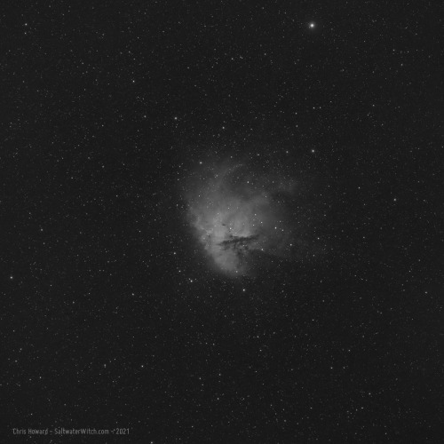 Imaging notes: 57 x 300-second subs in 3 nanometer hydrogen-alpha. No calibration frames. Guiding was better than expected, with total RMS hovering between .7 and .9 arcseconds. Seeing was below average–astronomical seeing, which is impacted by turbulence and temperature differences in the atmosphere. It’s pretty common to have a clear night with terrible seeing. There’s a time and place for twinkling stars–like writing a song, but they’re the bane of astrophotographers. Gear notes: ZWO ASI1600MM-Pro monochrome camera, Antlia 3nm Ha Pro narrowband filter, William Optics SpaceCat 51 apochromatic refractor, Sky-Watcher EQ6-R Pro mount.