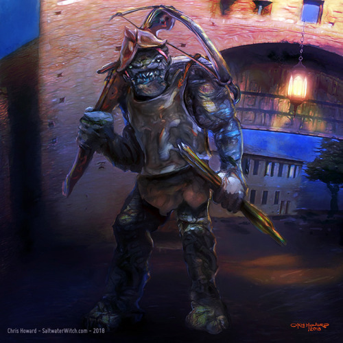Sergeant Detritus of the Ankh Morpork City Watch. Another one of my favorite Terry Pratchett characters. Detritus is a troll who’s pretty green as we follow him through the book Men at Arms, but he’s already a sergeant in Feet of Clay. One of the weapons he favors is a re-purposed siege crossbow named the “Piecemaker” that he’s modified to shoot multiple bolts at once.