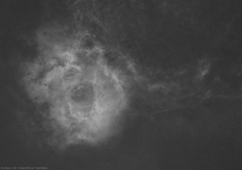 The large HII region, the Rosette Nebula (Caldwell 49) in the Constellation Monoceros, with the stars removed from the image. This just shows the roughly 500 trillion miles of hydrogen clouds with the surrounding empty space.