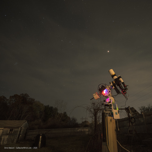 A shot of my larger astro mount and gear on the new pier in the backyard. It’s cloudy, but there’s M45, the Pleiades on the left and Mars straight up from the William Optics GT81 Apo refractor + 50mm guide scope. I took this with the Nikon D750, Irix 15mm f/2.4
