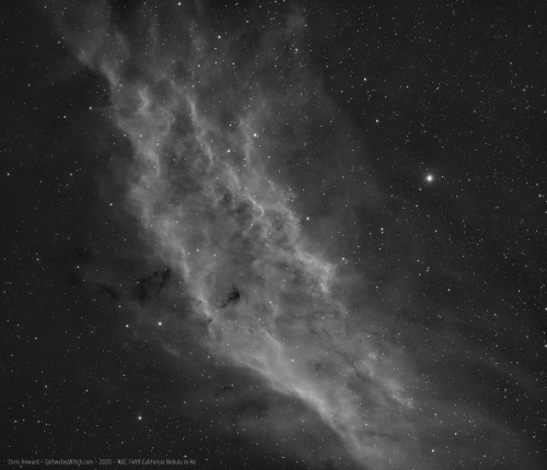 One from last night’s imaging run: California Nebula in Hydrogen-alpha. The California Nebula (NGC 1499) in the Constellation Perseus is relatively close to us, about 1000 lightyears away in the Orion Arm of our galaxy (Milky Way), and it’s roughly a 100 lightyears in length, so what you see here, top to bottom, is about 600 trillion miles of ionized hydrogen. NGC 1499 is a good-sized emission nebula, about 2.5° in length from our view on Earth. To put that into perspective, a full moon is 1/2°, so the California Nebula is about 5 full moons long in the sky.