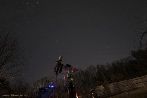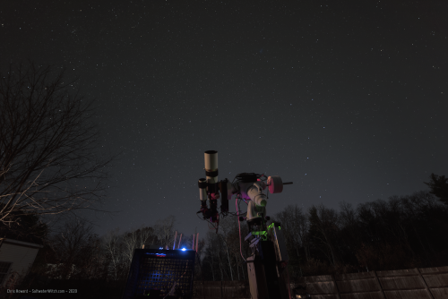 Wow, we actually have a pretty decent view of the universe from our backyard. Notes: Nikon D750, Irix 14mm f/2.4, 30-second exposures. That’s Ursa Major, the Big Dipper, to the right of the scope, that upside down W in the tree branches is Cassiopeia, and that bright star between them, a little to the left of where the scope is pointing, is Polaris, the North Star.