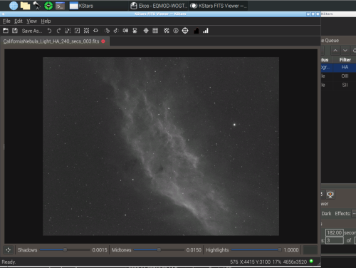 I ran some tests night before last with the Pacman Nebula (NGC 281), and only ended up with 7 sub-exposures and no calibration frames before the weather rolled in. Tonight I’m capturing 50 Hydrogen-alpha subs of NGC 1499, the California Nebula in Constellation Perseus. Gear notes: SkyWatcher EQ6-R Pro mount, William Optics GT81 Apochromatic Refractor 392mm at f/4.7, ZWO ASI1600MM-Pro monochrome camera, Astronomik 6nm Ha filter, Controller: Raspberry Pi 4 4GB / 128GB running Stellarmate 1.54, INDI/KStars/Ekos.