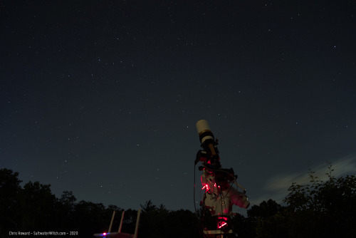 And this is why I think we all need to get out under a clear and relatively dark night sky once in a while. I was just looking up in wonder, setting the tripod with the D750 down once in a while to take a 30-second exposure. I wasn’t really thinking about what would be in the shot other than having my gear in the foreground–the focus isn’t great in this one, but that doesn’t really matter. It wasn’t until this morning, looking through a set of these, that I immediately saw Cassiopeia (that W asterism toward the top left) and the double star cluster in Perseus below. And from there my eye just follows that ramp of stars in the constellation Andromeda to the right. If you walk up those three stars angling out from the end of my scope (just to the left)–one more step and you’ll land on that softer smear of light. That’s M31, the Andromeda Galaxy. If you look along the left side of the scope where that brighter red LED light emerges, there’s a wedge of stars, like a slice of pizza, with the point closest to the scope. That’s the constellation Triangulum. There’s a dim dot of light up from the point star, angling toward the scope. That’s M33, the Triangulum Galaxy. All of this was in the sky above me–above all of us in the Northern Hemisphere. There’s so much more in this shot, but I would need to draw lines and write labels. What’s actually going in this shot–I mean, with my telescope, mount, cooled monochrome cameras and narrowband filters? I’m in the middle of taking 70 four-minute exposures of a large HII region in the constellation Cepheus, which is above Cassiopeia–partially, with some of it off frame. My astro blog: https://SaltwaterWitch.com